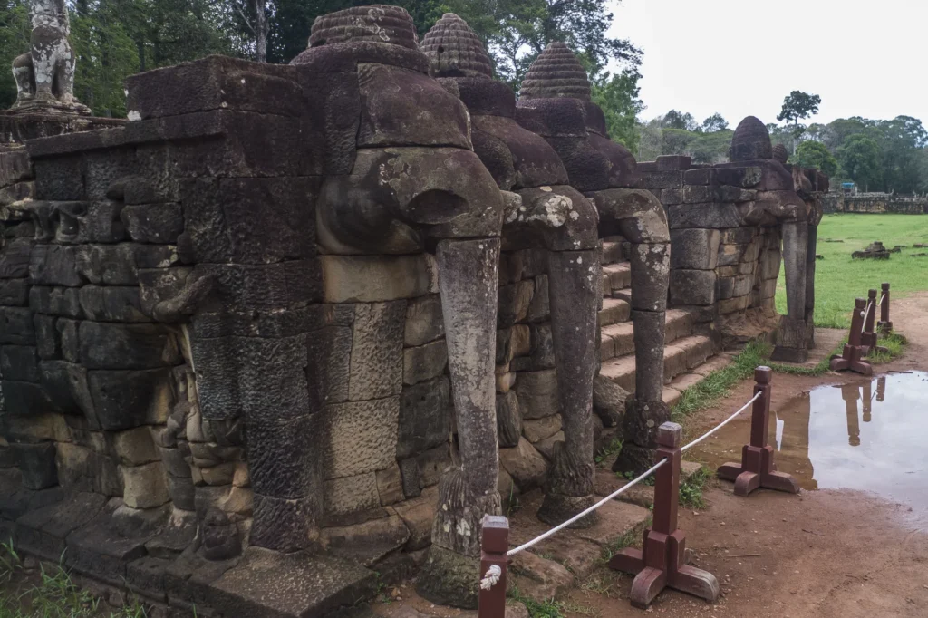 La terrasse doit son nom aux magnifiques bas-reliefs d’éléphants qui ornent ses murs. Ces sculptures grandeur nature représentent des éléphants en train de cueillir des fleurs de lotus avec leur trompe, symbolisant la force et la prospérité du royaume khmer.